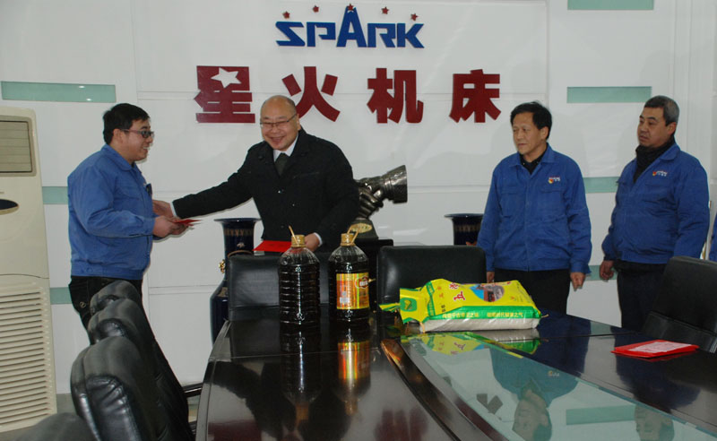 在星火機(jī)床公司小會議室,第四慰問組領(lǐng)隊、市國資委副主任江愛民,市國資委企業(yè)人事科科長王雙喜為優(yōu)秀黨員、困難黨員、老黨員發(fā)放了慰問品及慰問金,希望通過慰問活動,進(jìn)一步激勵黨員干部不忘初心、牢記使命,提振干事創(chuàng)業(yè)的精氣神。并提前祝大家春節(jié)快樂,身體健康。
