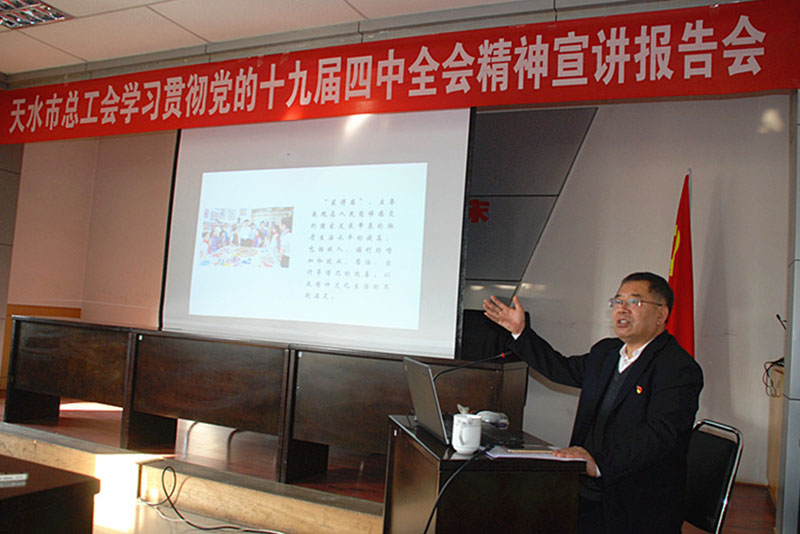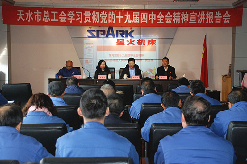 1月7日,天水市總工會學(xué)習(xí)貫徹黨的十九屆四中全會精神宣講報(bào)告會在星火機(jī)床公司舉行,天水市總工會邀請中共天水市委宣講團(tuán)成員、甘肅林業(yè)職業(yè)技術(shù)學(xué)院教授謝小平為星火機(jī)床公司黨支部書記、分會主席和部分員工作了《以制度優(yōu)勢托起人民獲得感、幸福感、安全感》為主題的黨的十九屆四中全會精神學(xué)習(xí)專題宣講報(bào)告。天水市總工會黨組成員、副主席張虎琴,副主席衡俊強(qiáng),星火機(jī)床公司黨委副書記、工會主席蔣俊及各黨支部書記、分會主席和部分員工80多人參加了報(bào)告會。衡俊強(qiáng)主持報(bào)告會。