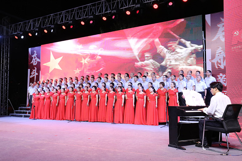 開場舞《紅色激情》拉開了演出序幕。公司各單位職工的大合唱,表達了對黨的無限熱愛和真誠祝福?!蹲鎳粫洝贰段倚摹贰段液臀业淖鎳贰陡伯a(chǎn)黨走》《歌唱祖國》《東方紅》等一曲曲經(jīng)典紅歌,在背景畫面的襯托下,將觀眾的思緒引入了中國共產(chǎn)黨帶領(lǐng)人民艱難創(chuàng)業(yè)的光輝歷史中。