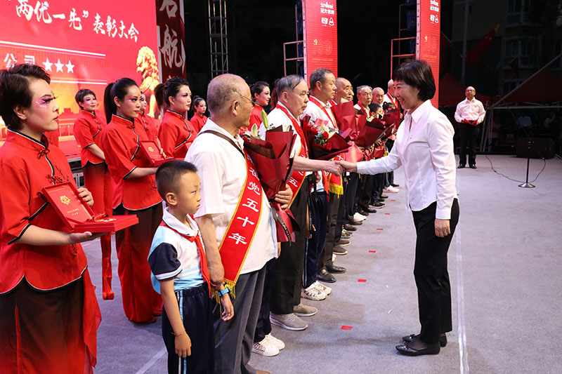 天水市人大副主任、市總工會主席王曉琴向“光榮在黨50年”老黨員代表頒發(fā)了紀念章。