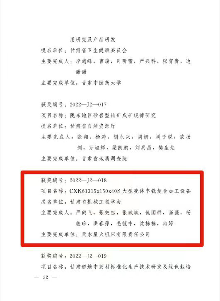 日前,甘肅省人民政府對(duì)在我省科學(xué)技術(shù)進(jìn)步、經(jīng)濟(jì)社會(huì)發(fā)展中作出突出貢獻(xiàn)的科學(xué)技術(shù)人員和組織進(jìn)行了評(píng)審獎(jiǎng)勵(lì)。由星火機(jī)床集團(tuán)公司機(jī)床研究院科研人員嚴(yán)鶴飛、張效忠、張斌斌、仇國群、高強(qiáng)、楊繼珍、洪春萍、毛毓中、沈棟棟、冉婷研發(fā)的CXK61315x150x40S大型殼體車銑復(fù)合加工設(shè)備榮獲甘肅省科學(xué)技術(shù)進(jìn)步獎(jiǎng)二等獎(jiǎng)。