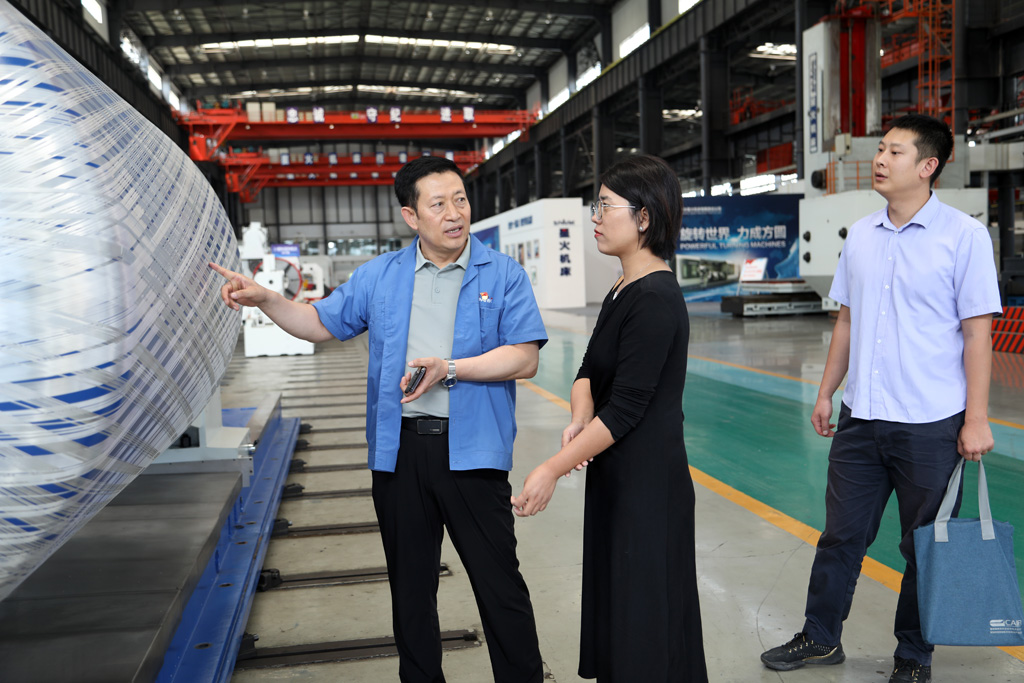 在裝配生產(chǎn)現(xiàn)場,總經(jīng)理劉勝向羅瑛娜一行詳細(xì)介紹了公司發(fā)展歷程、技術(shù)創(chuàng)新、產(chǎn)品性能以及在航空航天、軍工、船舶、工程機械等領(lǐng)域的應(yīng)用等情況,并陪同參觀了公司研發(fā)生產(chǎn)的各類大、重型機床產(chǎn)品。