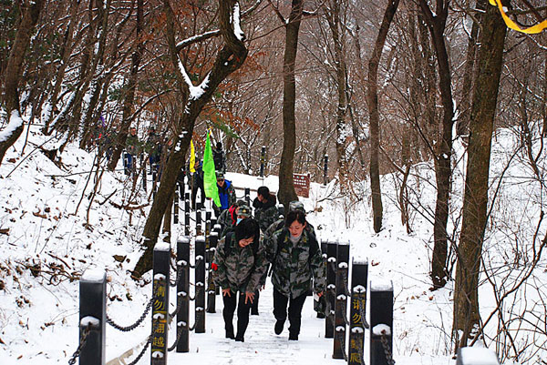 沿山繞行的臺階上覆蓋了一層薄冰和浮雪,讓大家不得不小心謹(jǐn)慎,聽著腳下咯吱咯吱的聲響,看著一直延伸目所不及的臺階,大家雖然疲倦之極,但他們都知道這是一次意志、毅力、體能的極限考驗(yàn),雖然有的同志體力不支,依然互相鼓勵、相互攙扶,一步一步向山頂行進(jìn)。