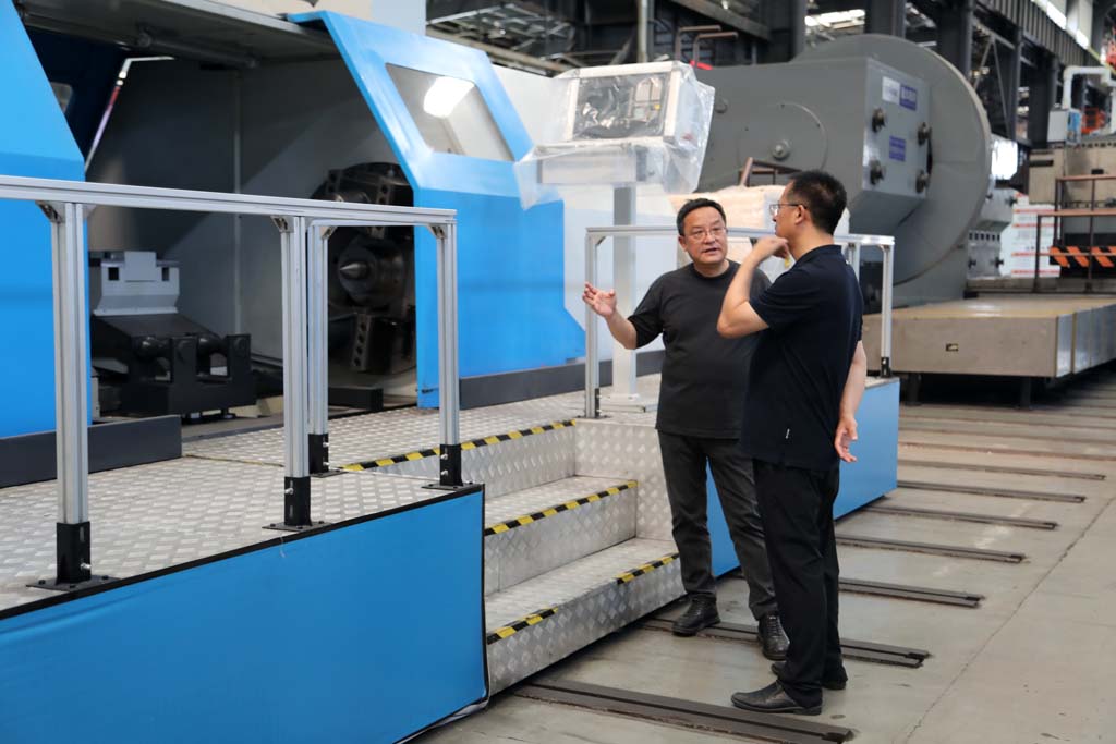 劉建一行在蔣保權陪同下參觀了工業(yè)園加工車間和各類產品裝配現(xiàn)場,向調研組重點介紹了生產裝配中的數(shù)控重型臥式車床、車輪車床以及五軸聯(lián)動機床等典型設備,并簡單回顧了企業(yè)的發(fā)展歷程和歷史沿革。