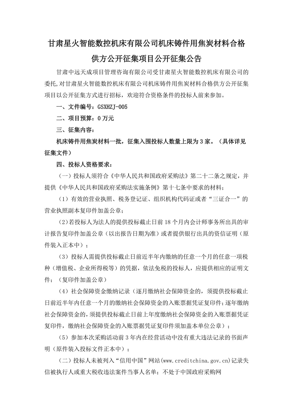 甘肅星火智能數(shù)控機床有限公司機床鑄件用焦炭材料合格供方公開征集項目公開征集公告