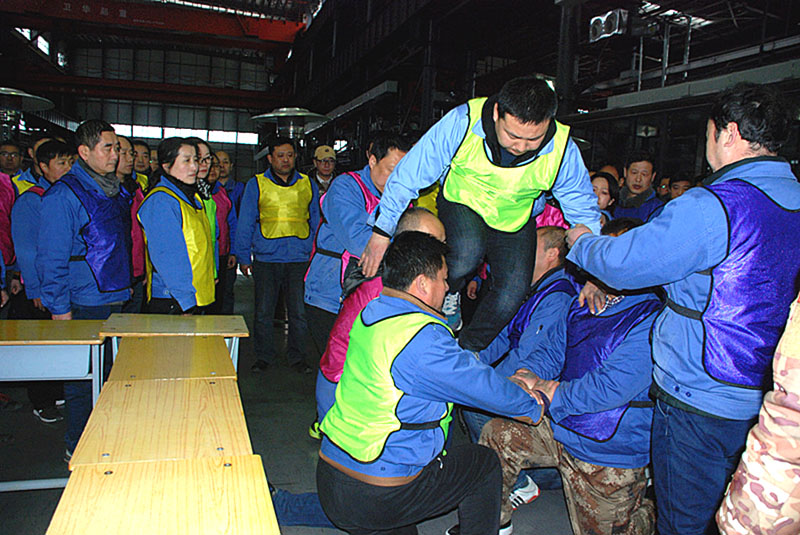 第二天,拓展培訓繼續(xù)進行。早上8點,培訓老師帶領(lǐng)大家進行情景模擬沙盤TTT標準課程——“沙漠掘金”。游戲的目的是鍛煉管理者的決策能力、目標管理能力及團隊的執(zhí)行能力、合作精神等。經(jīng)過沙盤模擬演練操作,10個隊中有5個隊因計劃不周、對天氣情況缺乏精準的判斷而導致“彈盡糧絕”,中途退出;2個隊因私下互換物品,違反游戲規(guī)則,被老師罰出局,最終僅有3支隊“活著”回到駐地,老師為獲得了第一名的隊頒發(fā)了獎勵金。下午進行了“盜夢空間”及“星火是最棒的”游戲項目。最后一個訓練項目“搶渡金沙江”,將本次培訓達到了高潮。此活動展示的場景為:我方隊伍需要渡過金沙江,但橋墩已被破壞,后有追兵,40分鐘就會趕到。這時候,就需要10個人,2人一組,單膝跪地,左右手交疊,模擬“橋墩”,讓隊友從自己手背上踩過去,在追兵趕到之前全部渡江。渡江過程中,若團隊成員有一個違反跑、跳、躍、跪、爬等違規(guī)動作,就得全體重新開始。規(guī)則明確后,隊長從自愿當“橋墩”的隊員里選定10人。活動開始,大家依次迅速“渡江”。遺憾的是,由于中途有隊員違反規(guī)則,“渡江”行動反復了3次。近60人幾次踩著10名“橋墩”的手背連續(xù)“渡江”,“橋墩”們的膝蓋和胳膊達到了支撐極限,手背布滿了黑黑的鞋印,可他們沒有一句抱怨、沒有絲毫退縮。震撼的場景、“橋墩”們默默的付出,感動著大家,隊友們含淚從他們手上踩過,現(xiàn)場發(fā)出陣陣抽泣聲。此時此刻,人與人之間的距離在拉近,心與心在靠攏,感情在悄悄的升溫,大家不僅是同事,更是生死與共的兄弟姐妹。正如培訓老師所講,一路走來,有沒有想過,我們的領(lǐng)導、我們的同事、我們的家人曾經(jīng)為自己所做的,我們又為他們做了哪些?作為“橋墩”,既然選擇了自己的路,就要無怨無悔的走下去,這是你的使命。