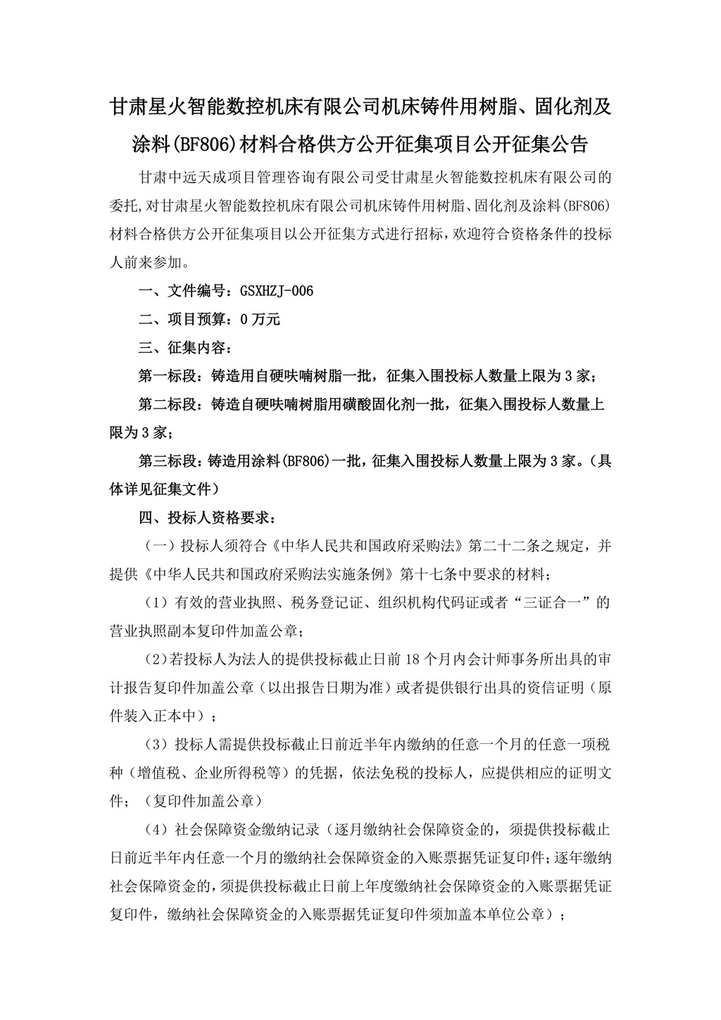甘肅星火智能數(shù)控機(jī)床有限公司機(jī)床鑄件用樹(shù)脂、固化劑及涂料(BF806)材料合格供方公開(kāi)征集項(xiàng)目公開(kāi)征集公告